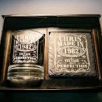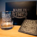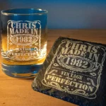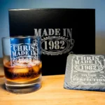 305cl quality solid base whiskey tumbler with matching slate 100mm square coaster, including an engraved name and year to make a totally personalised birthday gift.